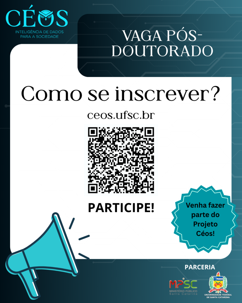 O Projeto Céos: Inteligência de Dados para a Sociedade, desenvolvido em parceria com o Ministério Público de Santa Catarina (MPSC), está com vaga aberta para pós-doutorado na área de Ciência da Computação. O projeto tem como foco o desenvolvimento e a implementação de soluções baseadas em Inteligência Artificial, Big Data, Computação de Alto Desempenho (HPC), Aprendizado Estatístico e Ciência de Dados, voltadas à coleta, integração, processamento e análise de dados para apoiar a tomada de decisão no setor público.